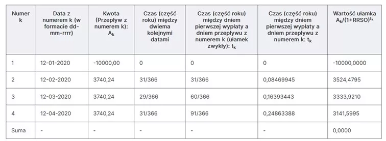 Gdyby przyjąć, że konsumentowi wypłacana jest kwota 10 000 zł, tak RRSO będzie równe: 1,0167840704; a zapisane jako wartość procentowa: 101,67%. Gdyby uznać w przykładzie, że na rzecz konsumenta została wypłacona pożyczka powiększona o koszty, to RRSO ulega diametralnej obniżce i wynosi 12,75%!